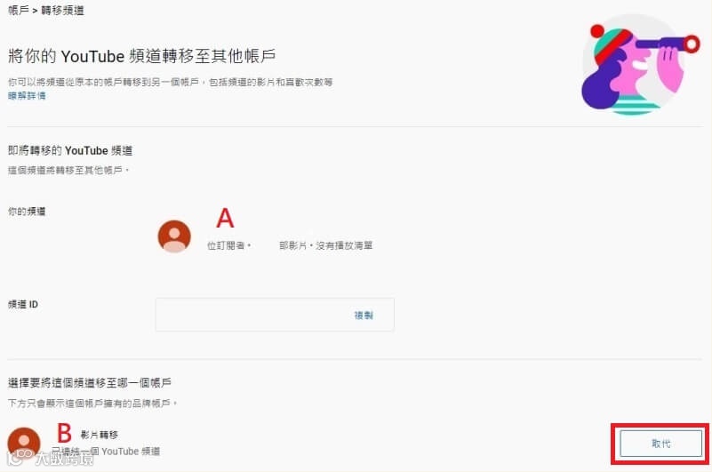 在“账户设置”中选择“转移频道”,使用新建的品牌账户(如“影片转移”)替换原有个人频道。此操作会将原频道A的所有视频内容迁移至品牌账户下,注意勾选“删除频道”选项以完成替换[k]。