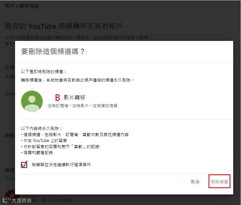 系统提示删除频道时无需担心视频丢失,实际仅清除空的品牌账户占位信息,原频道A的全部视频将完整保留在新品牌账户中[k]。