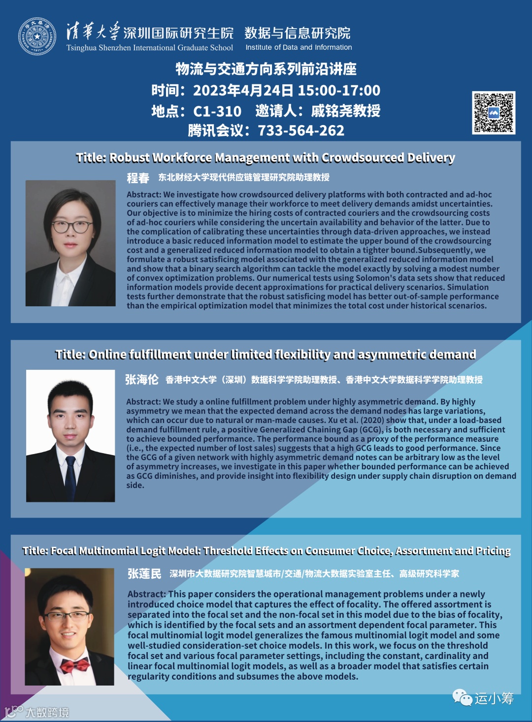张莲民,深圳市大数据研究院智慧城市/交通/物流大数据实验室主任、高级研究科学家。2013年在香港中文大学系统工程与工程管理专业获得博士学位,2014年-2020年任南京大学工程管理学院讲师、副教授。主要从事基于数据驱动的运营管理研究。已在Operations Research、Production and Operations Management、Naval Research Logistics、Decision Science、Transportation Research Part B、European Journal of Operational Research等国际SCI/SSCI期刊上发表学术论文40多篇。近年来,作为负责人主持国家自然科学基金项目2项,江苏省自然科学基金1项,并以主要人员参与国家级课题、政府及企业项目多项。