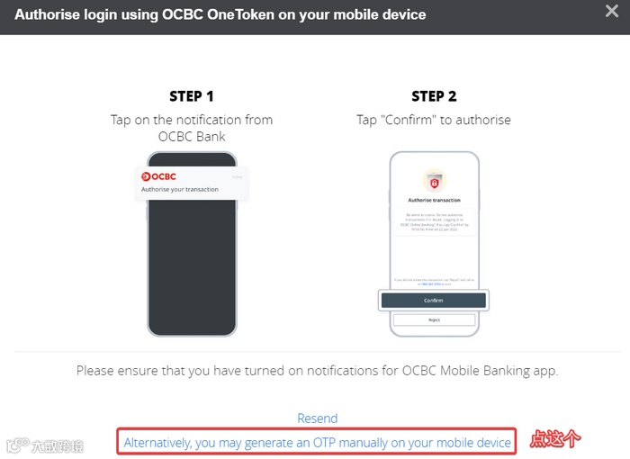 这时会弹出“OneToken”的二次认证,大概率国内网络收不到这个提醒,可以点击“Alternatively, you may generate an OTP manually on your mobile device”