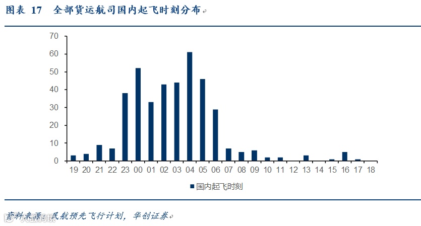 因我国目前没有货运枢纽机场,从排班看,国内货机只能在夜间飞行,即集中在23点-次日6点时段,考虑货物装卸等环节的时耗,基本只能飞两个航班,即一个来回。