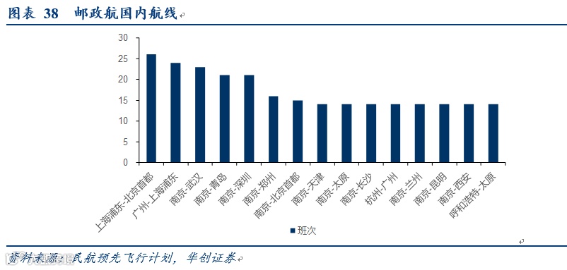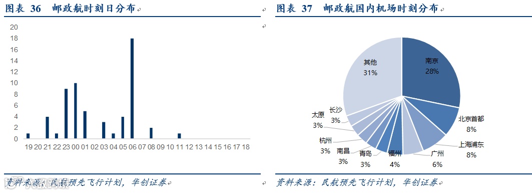 2.邮政航空:59对时刻,其中夜间时刻占比85%,南京为核心基地,国内线布局为主