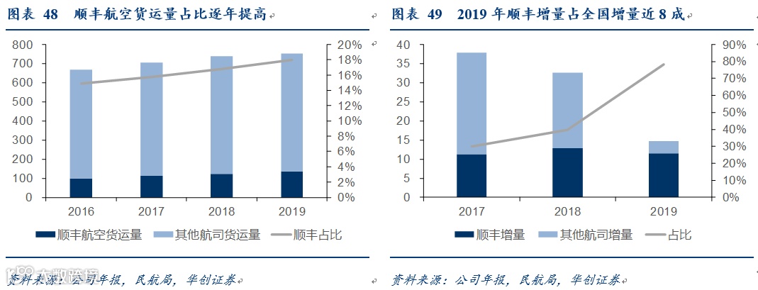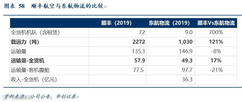 2)运输量:顺丰19年全货机运输量较东航物流多17%