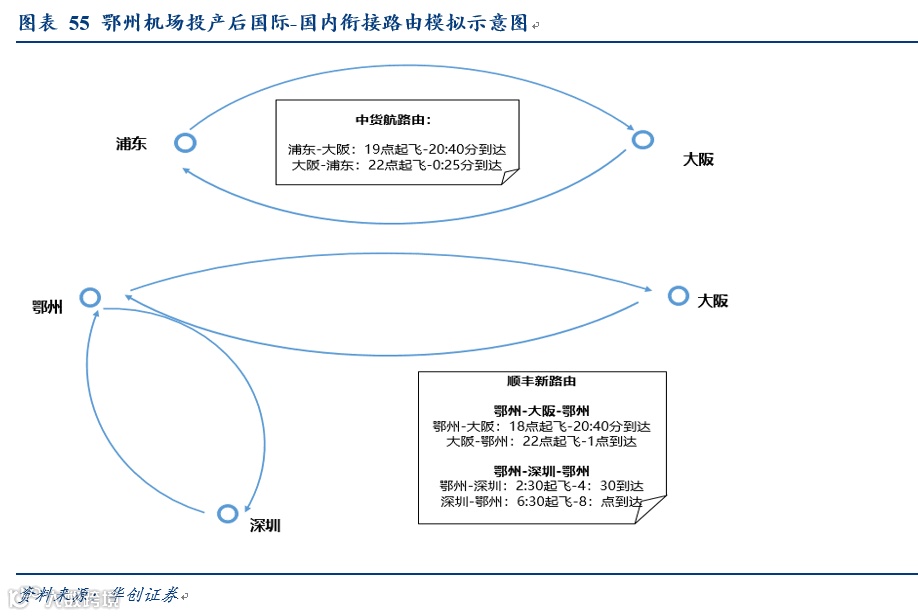 我们认为在相对理想的状态下,鄂州机场投产后,一旦顺丰获取较好的非夜间时刻(或从夜间时刻向前向后各延长部分时段),即可完成相对有效的国际-国内航线连接,由此可使得公司飞机利用率提升一倍成为可能。