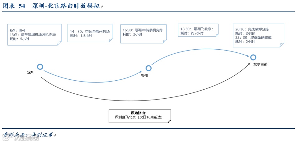 即便次日配送,也相较于当前深圳-北京需要在次日18点前送达而言明显提升时效。(注:理论模拟,实际操作或有多重限制需论证)。