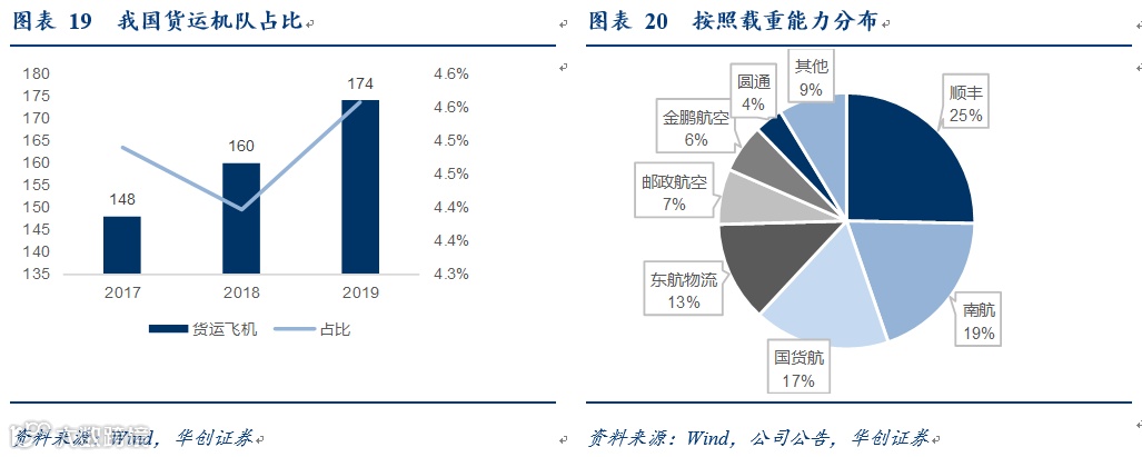 东航物流:2019年9架全货机,3架B747,6架B777,均为宽体机,其载运能力接近1000吨,占行业比重约13%。