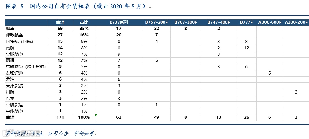 机队数量看:顺丰截止2020年5月有72架全货机(59架自有+13架租赁),占全国货机机队4成。