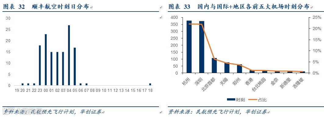 时刻:分析时刻表,统计顺丰航空136对时刻,按照起飞看,高峰时段集中于23-5点之间,占时刻比重的96%,其他时段仅有零星航班,白天客运高峰时段8点-17点完全没有航班起降。