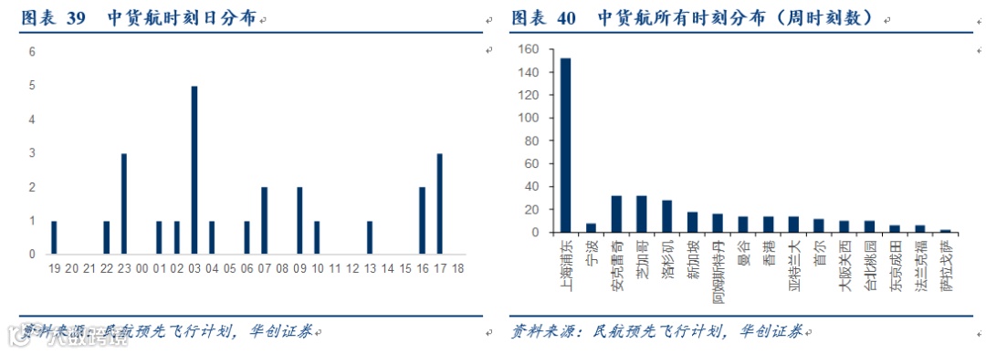 时刻:中货航为东航物流旗下全货机机队,统计时刻表,其25对时刻,全部为国际+地区航班,夜间时刻占比仅48%,上午7点到10点,下午4点与5点合计有10个时刻,占比40%。