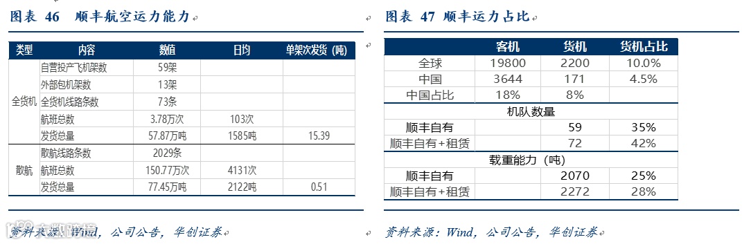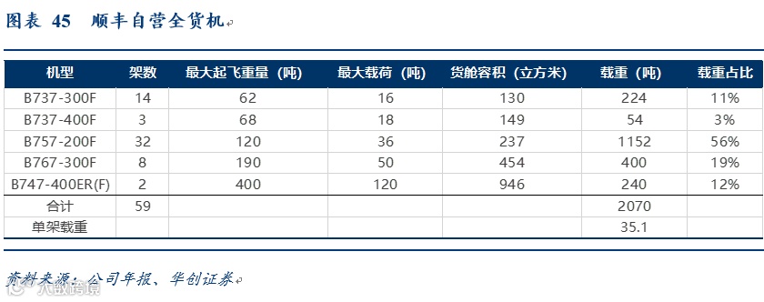 顺丰航空:目前59架自有+租赁13架,合计72架全货机,但窄体机为主,测算载运能力约2270吨,占行业比重28%,为东航物流载运能力的2倍。