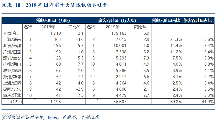 从2019年我国前十大货运机场看,除了郑州机场位列货运第7(客运第12)外,其他机场均为客、货双前十机场。货运前十大机场吞吐量占全国机场吞吐量的69.8%,而客运TOP10占比为41.9%,货运吞吐量明显更为集中。