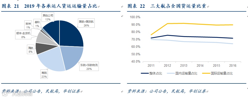 三大航凭借客机腹舱占据了国际货运市场相对垄断地位,预计三大航(含货机口径)2019年占国际货运量约90%,而国际货运量也占自身比重在34%-37%。