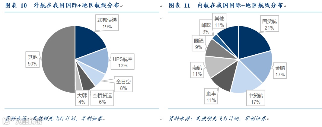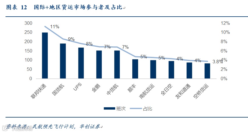 前五大航司分别为联邦快递(11.3%)、国货航(8.6%)、UPS(7.6%)、金鹏(6.9%)和中货航(6.9%)。
