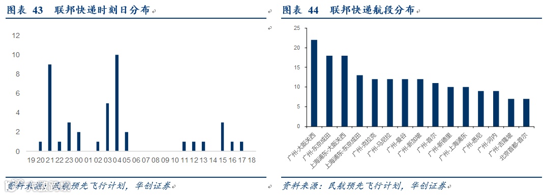 时刻:统计时刻表,联邦快递42对时刻,均为国际航班,其中夜间占比55%,非夜间占比45%,白天时刻中,上午11点到下午5点有8个时刻,占比19%,20点-22点亦有11个时刻,占比26%。