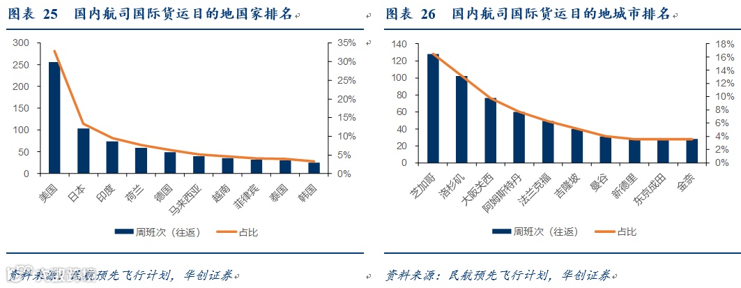 航线角度,上海浦东-芝加哥(周32班)、上海浦东-洛杉矶(周28)和上海浦东-新加坡(周18)为前三大航线。