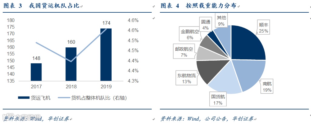 载运能力看:顺丰货机机队数量占比4成以上,载重能力占比约3成。