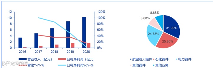 2020 年,公司实现营业收入 6.71 亿元,同比增长 13.91%;归母净利润 0.73 亿元,同比 增长 34.96%。在全球军用和商用航空发动机双引擎驱动下,公司航空环锻件市场广阔。