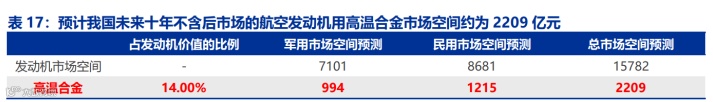 我们预计,我国未来十年不含后市场的航空发动机用高温合金市场空间约为 2209 亿 元。