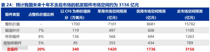 基于高温合金的价值占比以及上文对我国航空发动机市场空间的预测,我们预计我国未来十年不含后市场的军用航空发动机高温合金市场空间约为 994 亿元,民用航空发动机高温合金市场空间约为 1215 亿元。