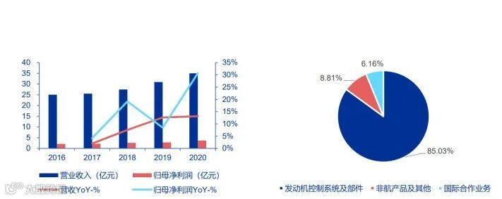 2020 年,公司实现营业收入 34.99 亿元,同比增长 13.14%,2020 年实现归母净利润 3.68 亿元,同比增长 30.68%。控制系统为航空发动机核心子系统,占据产业链关键位置,受益于军机型号放量以及民用国产替代加速,公司作为龙头企业有望得到长足发展。