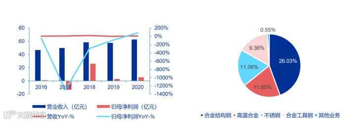 公司产品弥补了我国新型战机、大飞机、直升机、航空发动机、舰船制造所需关键材料的“短板”。2020 年,公司营业收入为 21.13 亿元,同比增长 46.10%;归母净利润为 3.71 元,同比增长 134.31%。