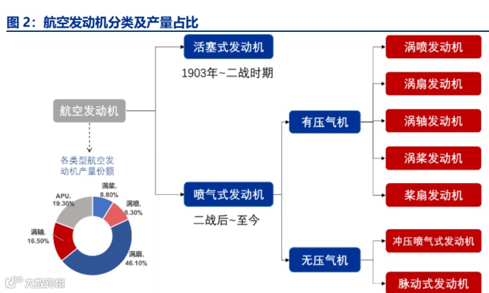 喷气式发动机可以产生很大的推力,而自身重量又较轻,能够大幅提高飞机的飞行速度,因此得到了广泛的应用。按压气机种类可分为涡轮喷气式发动机、涡轮风扇式发动机、涡轮螺旋桨式发动机、涡轮轴式发动机和螺旋桨风扇发动机。目前,应用最广的是涡扇发动机, 2020 年全球产量占比高达 46.10%。