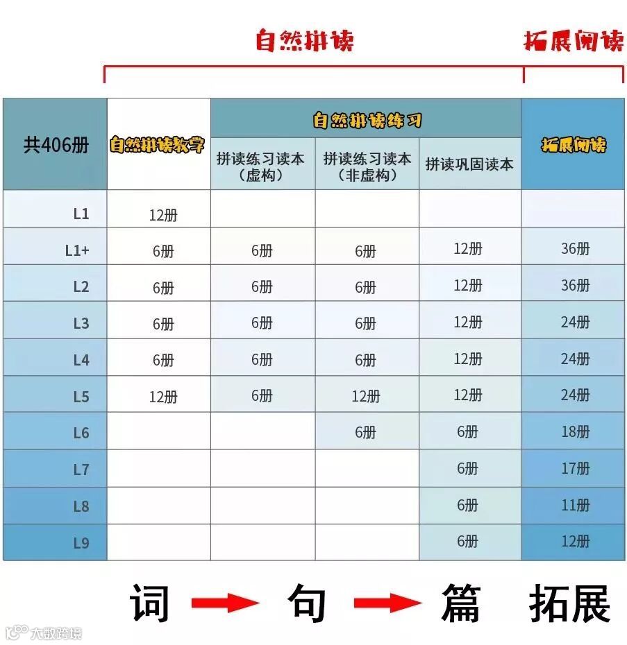 学校版整个系列从儿童阅读前的准备行为,到早期的自然拼读学习,再发展到更多更复杂文字的阅读和理解,囊括了整个儿童阅读发展过程。