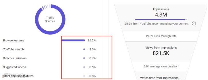 流量主要依赖YouTube推荐机制(占比超97%),搜索流量仅占2.6%。观看设备以移动端为主,符合当前主流趋势。[k]