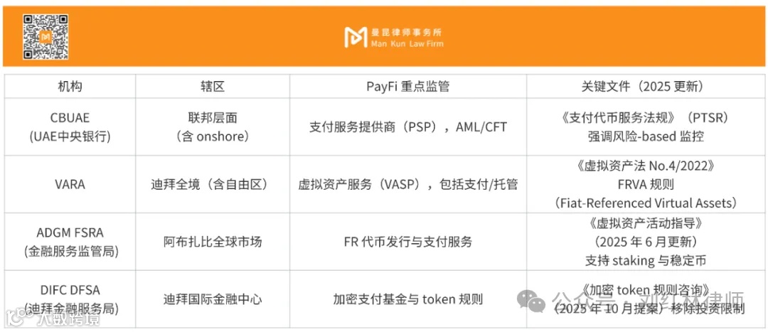 UAE 的 PayFi 业务监管呈 “分而治之” 格局,四大支柱各司其职: