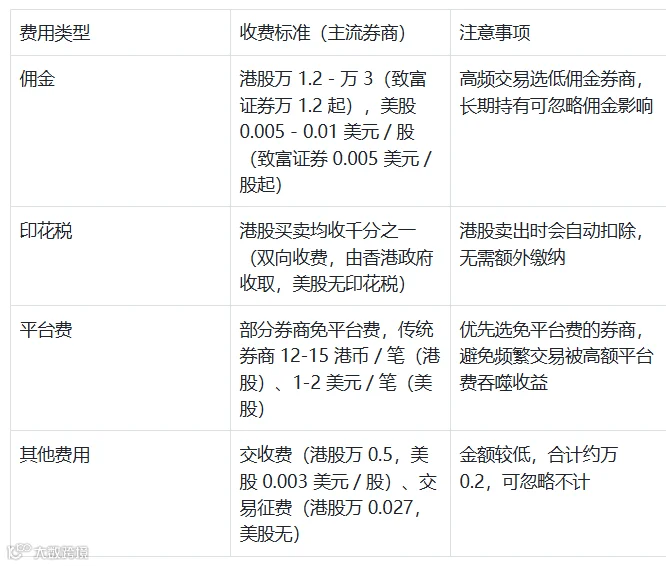 💡 费用测算示例:用致富证券买 10 万港币港股(股价 10 港币,买 1 万股),佣金万 1.2(12 港币)+ 印花税 100 港币(卖出时收)+ 交收费 50 港币,合计 162 港币,成本率 0.162%,远低于传统券商。