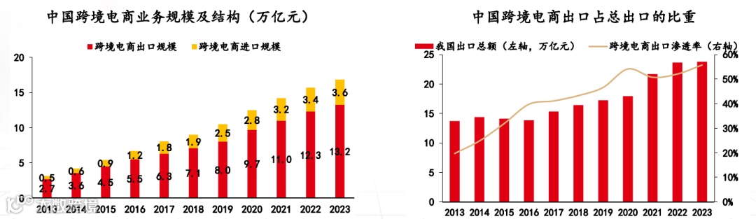 我国跨境电商业态持续深化、规模稳步增长,2023 年进出口交易额 16.85 万亿元(同比增 7.3%),其中出口 13.2 万亿元(同比增 7.6%),占比 78.6%;其出口渗透率已处高位,2023 年达 55.7%,同比提升 2.7 个百分点。