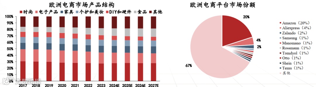 欧洲是时尚高地,2023 年时尚(27.27%)、个护美妆(9.21%)为电商热门,两者合计超 1/3,前六大品类占 81.79%;亚马逊以 20% 份额居首,垂类平台表现亮眼,AliExpress 凭早期布局、Shein 靠性价比时尚女装契合当地需求。