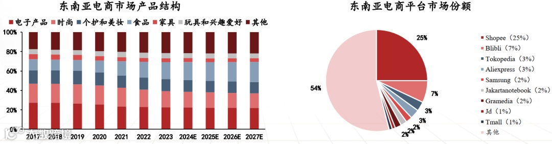 东南亚电商市场受社交媒体带动,电子产品(22.73%)、时尚(16.53%)、个护美妆(12.39%)为热门品类,前六大品类占 78.4% 份额;这里以亚洲平台为主,Shopee 以 25% 份额稳坐龙头,Blibli 占 7%,AliExpress、Tokopedia、京东、天猫等中国出海平台均有一定影响力。