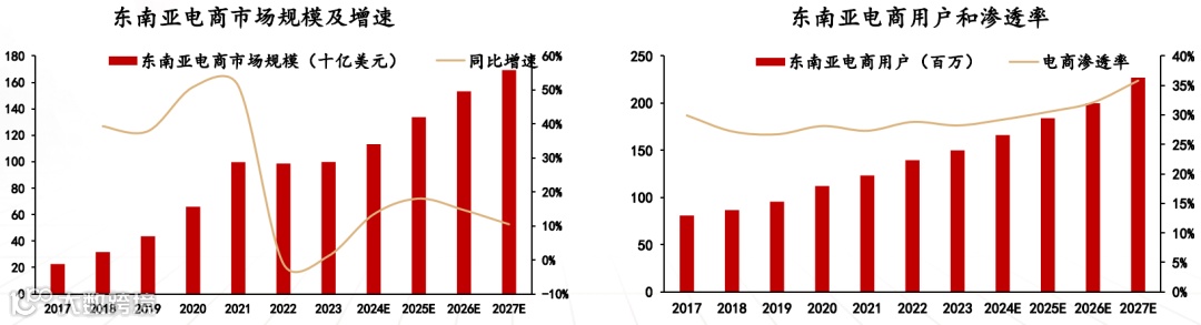 东南亚是跨境电商出口的 “新兴潜力场”,2023 年电商市场规模近千亿美元,2017-2023 年以 27.93% 的高年复合增长率火箭式增长;2023 年电商用户达 1.4 亿(同比增 7.53%),渗透率 28.2%(同比增 3.94%),线上购物用户正快速扩容。