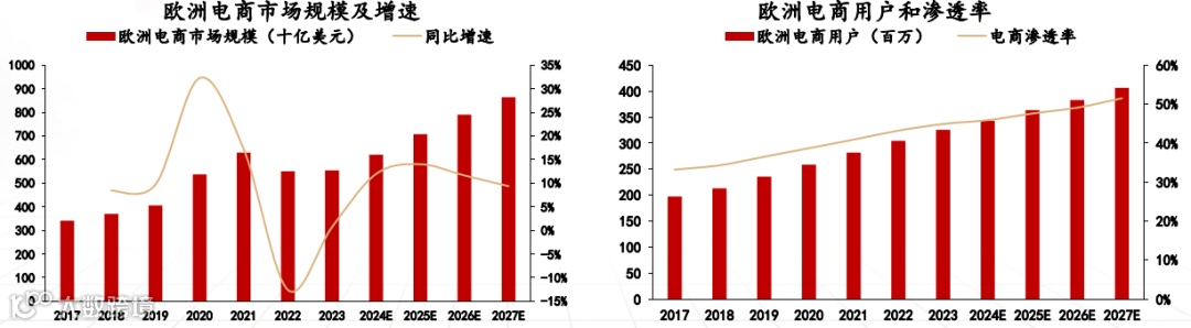 欧洲是跨境电商出口的 “重要主力市场”,2023 年电商市场规模达 5543.9 亿美元,2017-2023 年以 8.41% 的年复合增长率稳步扩张。这里的电商用户基数大、渗透率不低,2023 年用户近 3.3 亿(同比增 6.96%),渗透率 44.9%(同比增 3.94%),相当于接近一半人习惯线上购物,预计 2027 年渗透率将超过 50%。