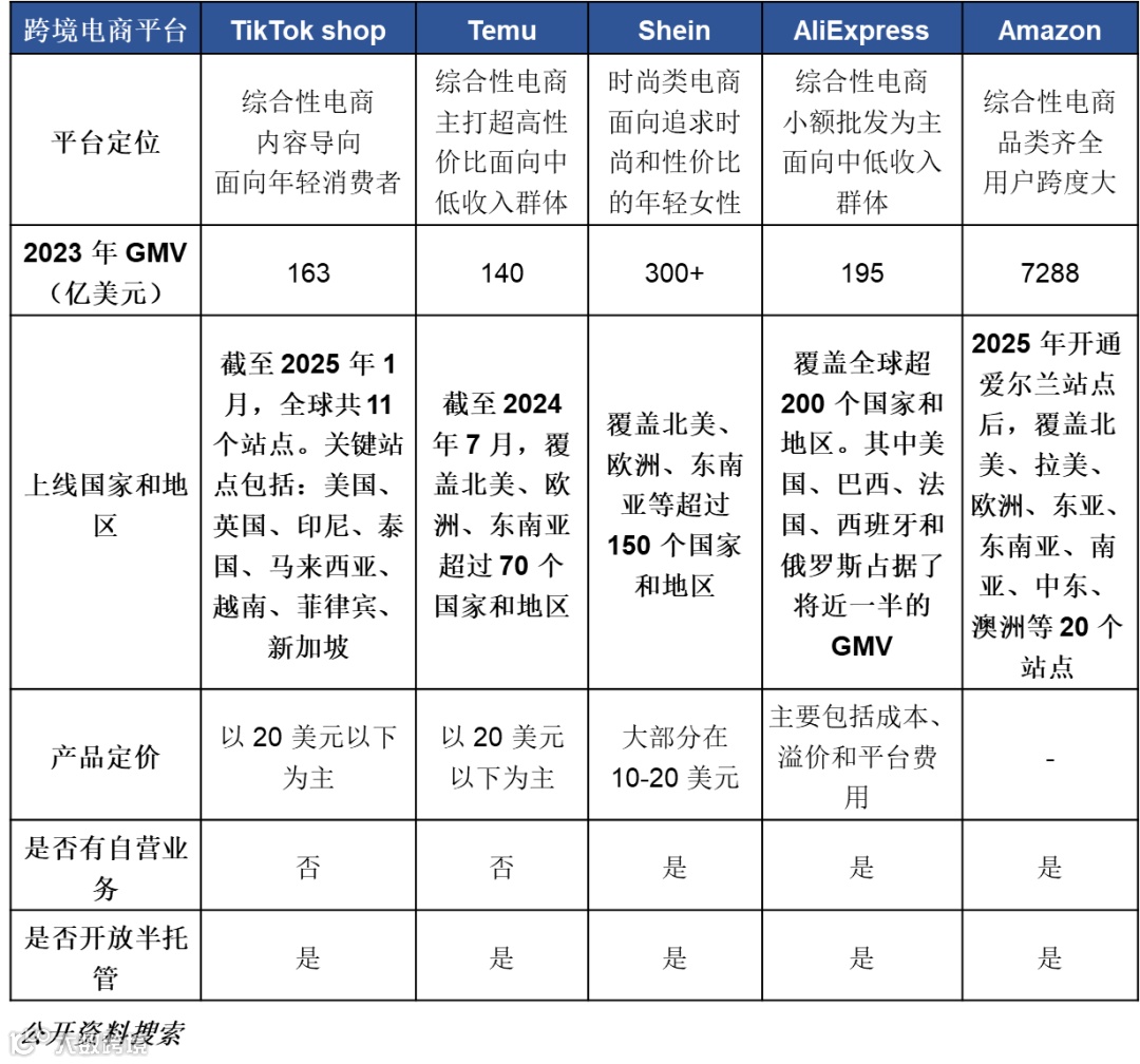 TikTok Shop 是内容导向综合电商(GMV163 亿美元,11 站点);Temu 主打高性价比(GMV140 亿美元,超 70 国);Shein 聚焦时尚类(GMV300 + 亿美元,超 150 国);AliExpress 做小额批发综合电商(GMV195 亿美元,超 200 国);Amazon 是全品类巨头(GMV7288 亿美元,20 站点)。其中 Shein、AliExpress、Amazon 有自营业务,五平台均开放半托管模式。