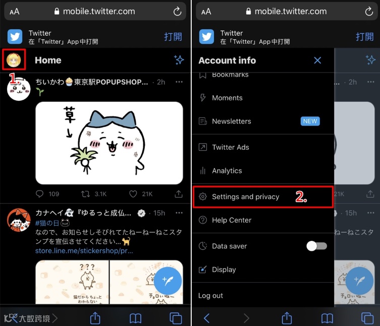 点击左上角个人头像,选择「Settings and privacy(设置和隐私)」[k]。