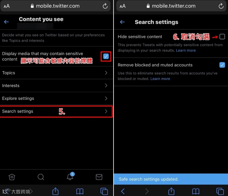 勾选「显示可能含敏感内容的媒体」,并进入「Search settings(搜索设定)」取消勾选相关过滤选项,即可解除限制[k]。