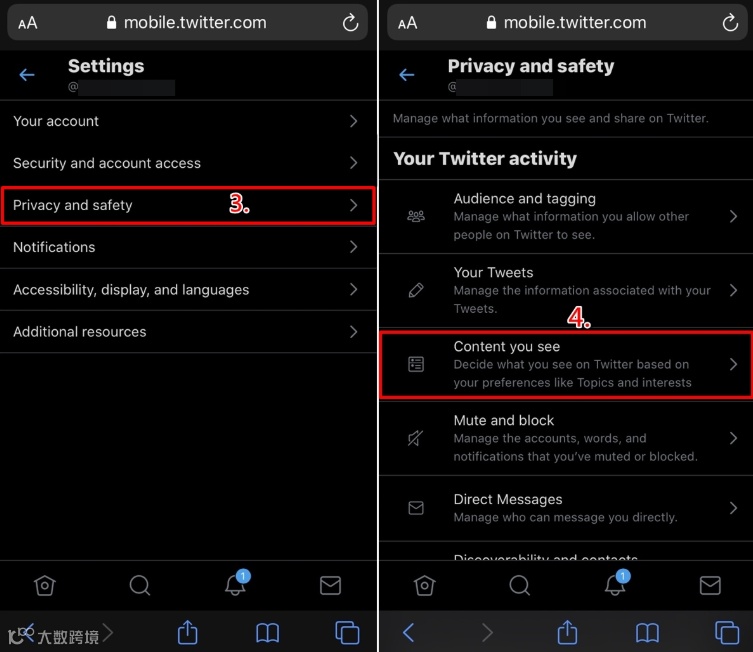 进入「Privacy and safety(隐私与安全)」>「Content you see(你看到的内容)」[k]。
