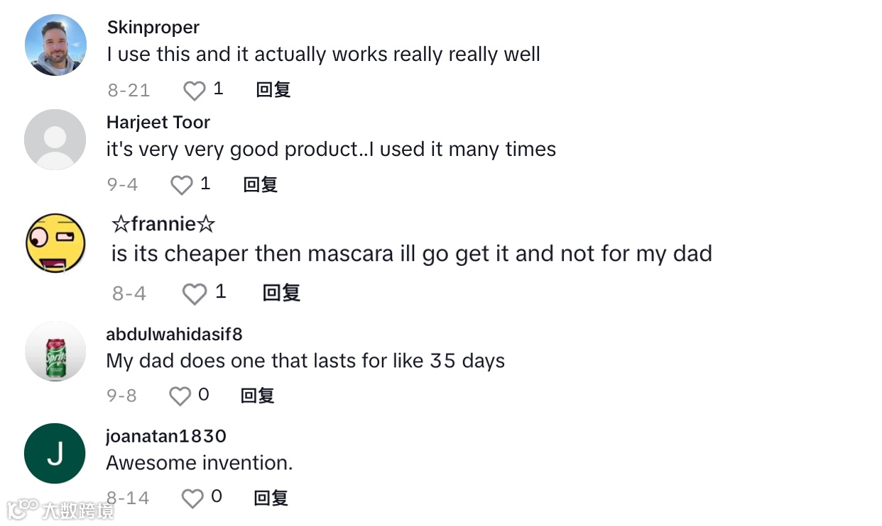 TikTok评论区有人反馈这款产品很好用,效果持久,也有人质疑这是否就是黑色睫毛膏……无论如何,卖睫毛膏的卖家倒是可以关注一下,包装成男士专属的新品,不是没有成为黑五爆品预测的可能。