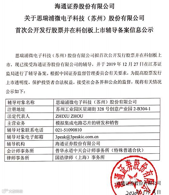 集微网消息 1月20日,中国证监会江苏监管局网站发布消息称,思瑞浦微电子科技(苏州)股份有限公司(下称“思瑞浦”)将赴科创板上市,已接受海通证券辅导,并于2019年12月27日在江苏证监局进行了辅导备案。