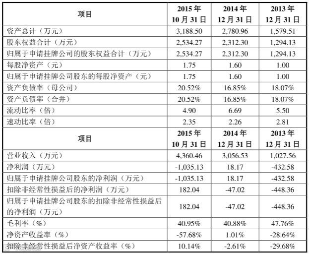 据资料显示,思瑞浦微电子科技(苏州)股份有限公司成立于2012年4月,于2016年1月完成股改。主营业务为模拟集成电路芯片的研发和销售。2013年、2014年和2015年1-10月,思瑞浦分别实现营业收入1027.56万元、3056.53万元、4360.46万元,逐年增长,但实现归属于挂牌公司股东净利润分别为-432.58万元、18.17万元和-1035.13万元,波动较大。