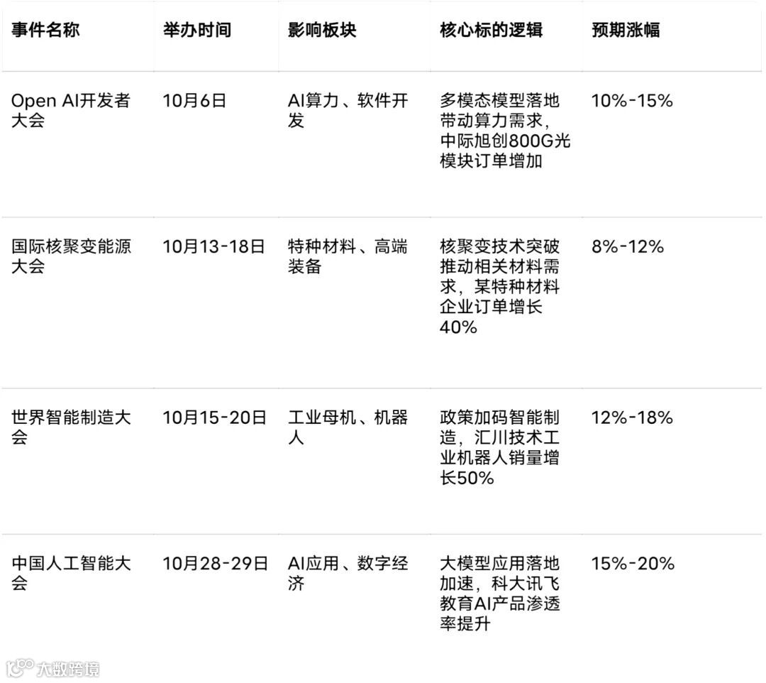 10月堪称"事件密集月",从10月6日Open AI开发者大会到31日三季报收官,重大事件超15起,平均每2个交易日就有1个潜在催化事件。这种密集事件容易引发市场情绪的"追涨杀跌":Open AI大会发布多模态模型后,AI算力板块单日上涨4.5%,但次日因缺乏实质订单落地又回落3.2%