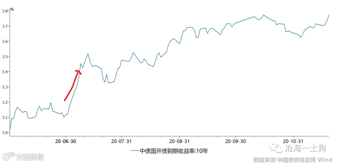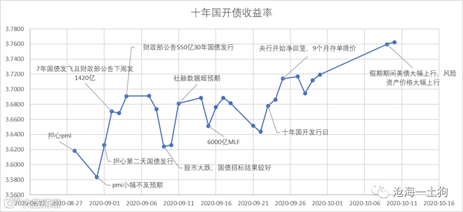 在一开始的时候,市场并没有把通胀当回事,因为大家都知道通胀是猪肉贡献的,甚至调侃:剔除了猪肉都是通缩。但是,十一之后,大家开始慌张了,因为猪肉价格涨太快了,于是,债券收益率开始狂飙,