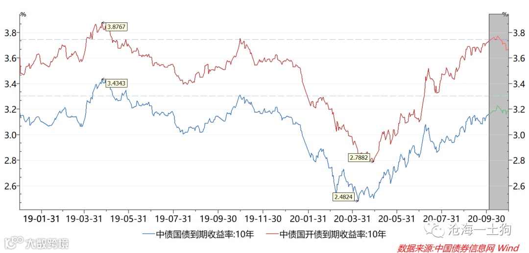 十年国开债的收益率从10月17日的3.55%一路飙升到10月30日的3.76%,上行了21bp。后来央行降息了5bp,收益率就开始掉头向下,在11月19日又回到了3.55%。