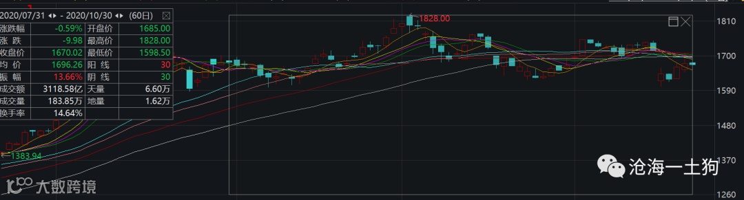 符合我们直觉的是贵州茅台在最近60个交易日的走势,30根阳线30根阴线,最后累计下跌了0.59%。