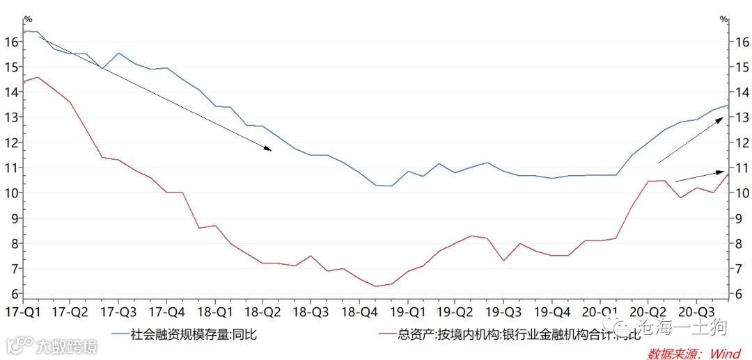 此外,在供需这个大框架下,还有一个标尺就是社融增速,