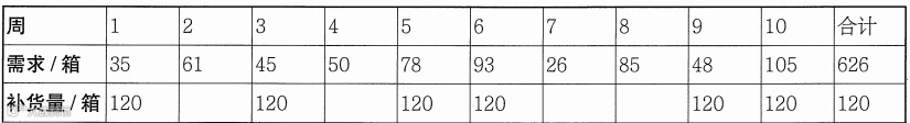 库存计划人员有时会根据事先与供货方设定的固定数量进行订货。这种固定数量可能源自运输工具容器的限制或生产的批量要求。使用这种方法进行订货,补货量、期末库存和库存成本的表现如表所示。此处假设补货均于每周初到货,每次补货量为120 箱。