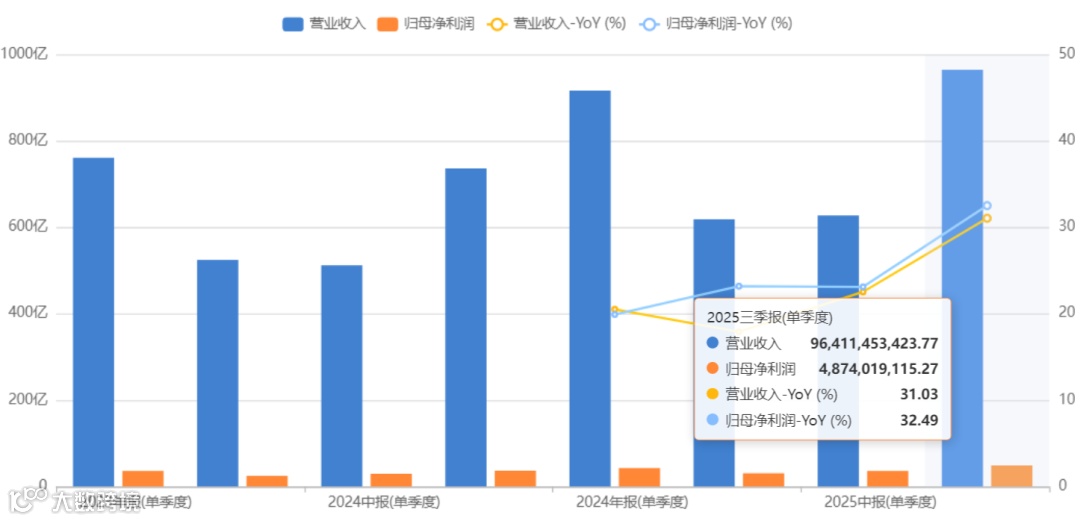 从单季度来看,25Q3表现尤为强劲,实现营业收入964.11亿元,同比增长31.03%,环比增长53.73% 。归母净利润实现48.74亿元,同比增长32.49%,环比增长35.36% ,同样超出了42.4-47.0亿元的指引上限 。