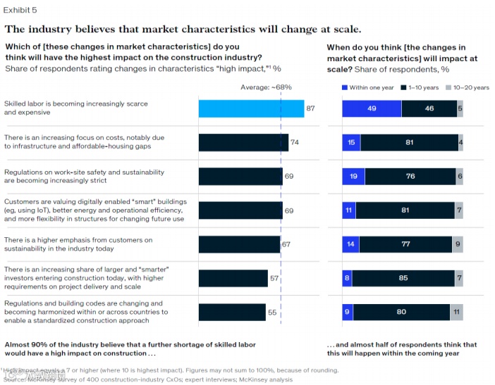尽管项目的执行越来越需要经验和技能,但建筑工程仍然依赖于大量蓝领劳动力完成大量体力劳动。建筑公司通常面临着技术劳动力的严重短缺,这既阻碍了现有的运营,也阻碍了数字化等创新。我们的调查强调劳动力短缺是建筑业的主要问题之一,在我们的调查中,约 85%的受访者表示,危机前这一问题就已十分严峻,尽管即将到来的经济动荡可能会改变这一状况,较低的进入壁垒和大量的非正规劳动力使小型和非生产性公司加入了行业竞争。
